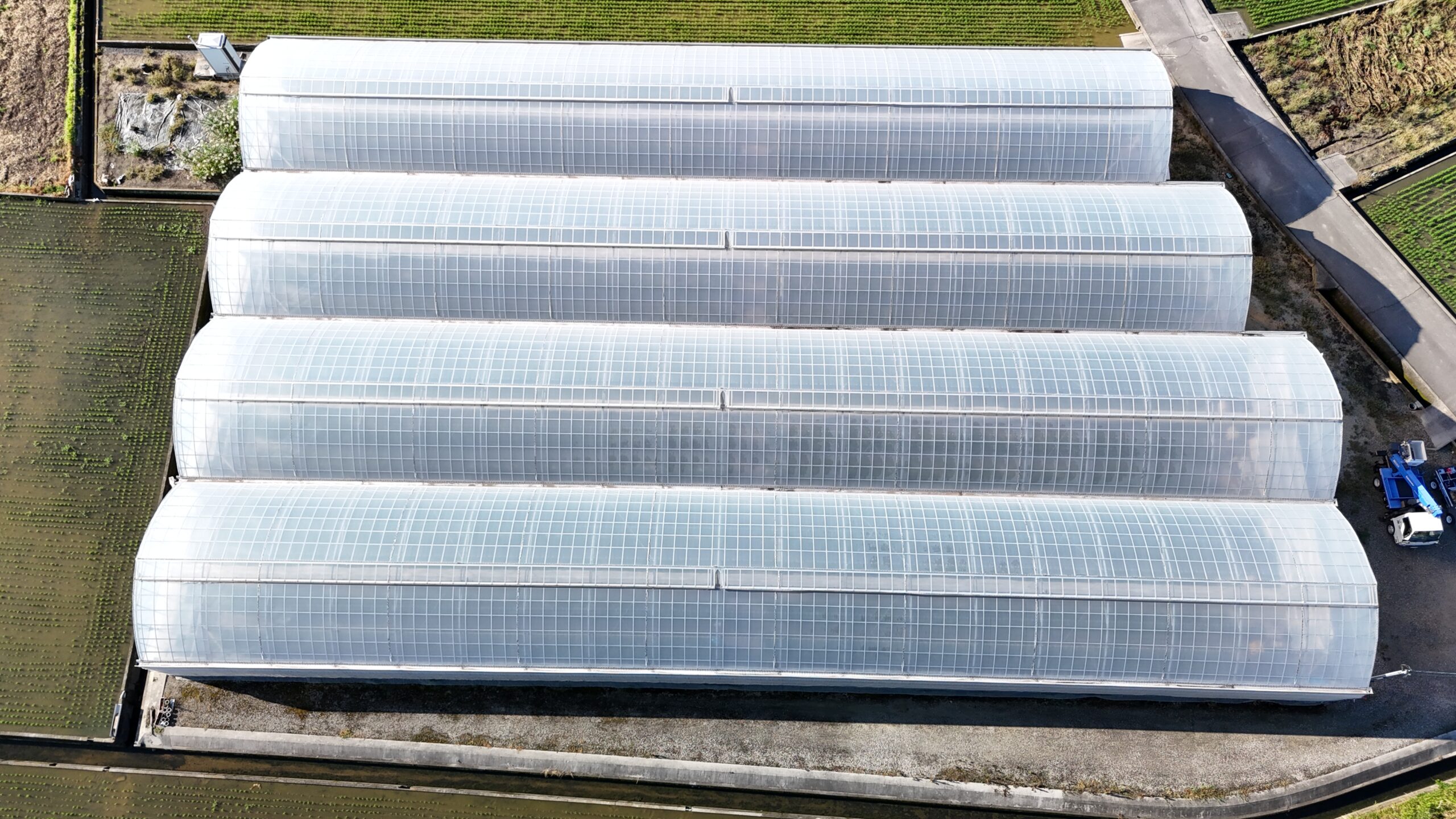 夏真っ盛りの7月中旬、ドローン散布業を始めて初のミニトマトハウスへ遮光剤の散布をしました。