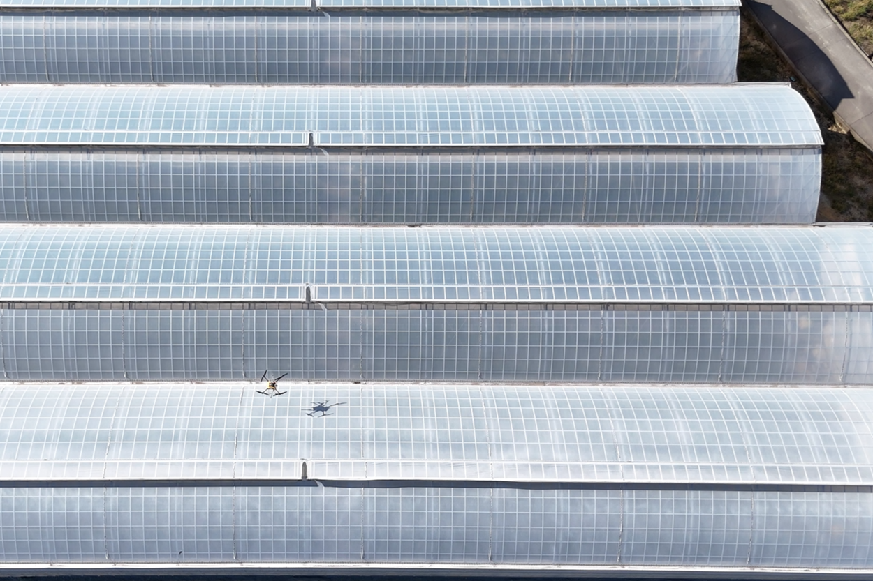 夏真っ盛りの7月中旬、ドローン散布業を始めて初のミニトマトハウスへ遮光剤の散布をしました。